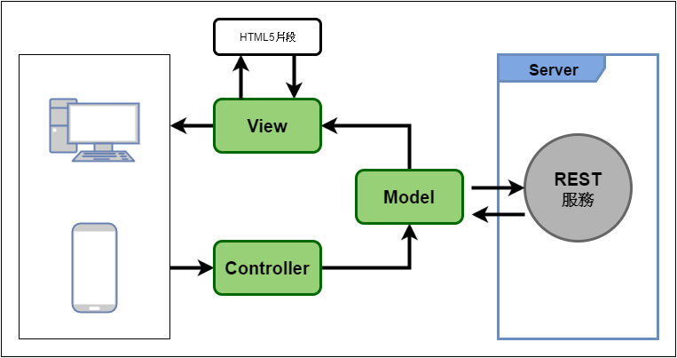 透過後端的REST服務(Representational State Transfer,具象狀態傳輸)處理業務邏輯。
